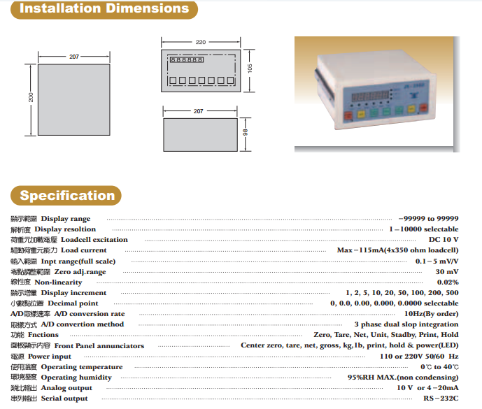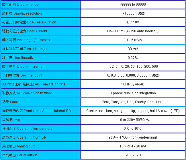 產(chǎn)品描述:臺(tái)灣JIHSENSE JS-2000_JS-2000顯示器系高功能高精度顯示器,本顯示器針對(duì)應(yīng)變規(guī)式感測(cè)器所設(shè)計(jì),有絕佳的穩(wěn)定性,類比信號(hào)可提供+/- 10V或4-20mA輸出,A-D採(cǎi)用最精確的雙斜率積分方式,每秒鐘取樣10次,本顯示器所有設(shè)定工作均由前面版的按鍵輸入,特別設(shè)計(jì)的總重修正功能,可讓使用者精確調(diào)整重量,使校正工作快速精確。
