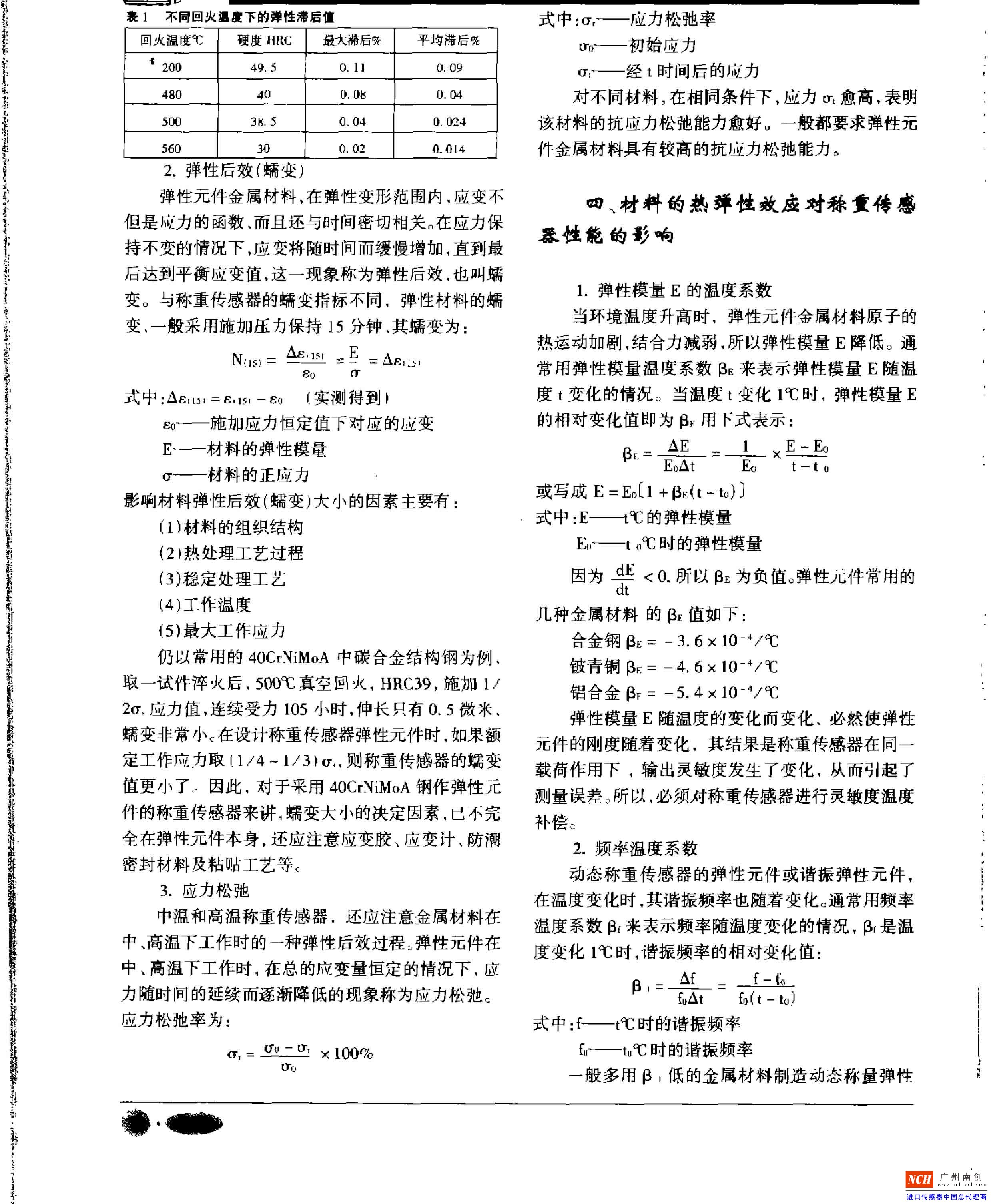 1 彈性滯后彈性元件金屬材料,在加載與卸載的正反行程中,應(yīng)力應(yīng)變曲線不重合,而構(gòu)成一個回線環(huán),即對應(yīng)同一應(yīng)力有不同的應(yīng)變值8和s1,其差值△s=e 一e叫彈性滯后。在不同的應(yīng)力下,彈性后也不同,一般用最大相對滯后的百分數(shù)表示,即R: 壘!6…式中:s一——最大載荷下的總應(yīng)變△s…——最大的應(yīng)變滯后以40CrNiMoA中碳合金結(jié)構(gòu)鋼為例,由于化學(xué)成分一致,其彈性滯后是和它的微觀組織結(jié)構(gòu)有關(guān) 不同的回火溫度,得到不同的金相組織。取1/20",應(yīng)力值進行試驗,其彈性滯后的結(jié)果如表1所示。CHZ廣州南創(chuàng)電子科技有限公司