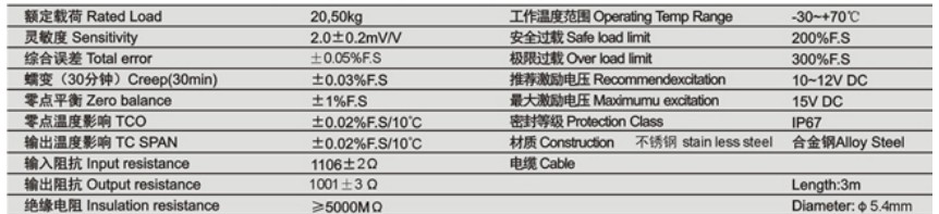 US-50KG稱重傳感器技術(shù)參數(shù):YAo廣州南創(chuàng)電子科技有限公司
