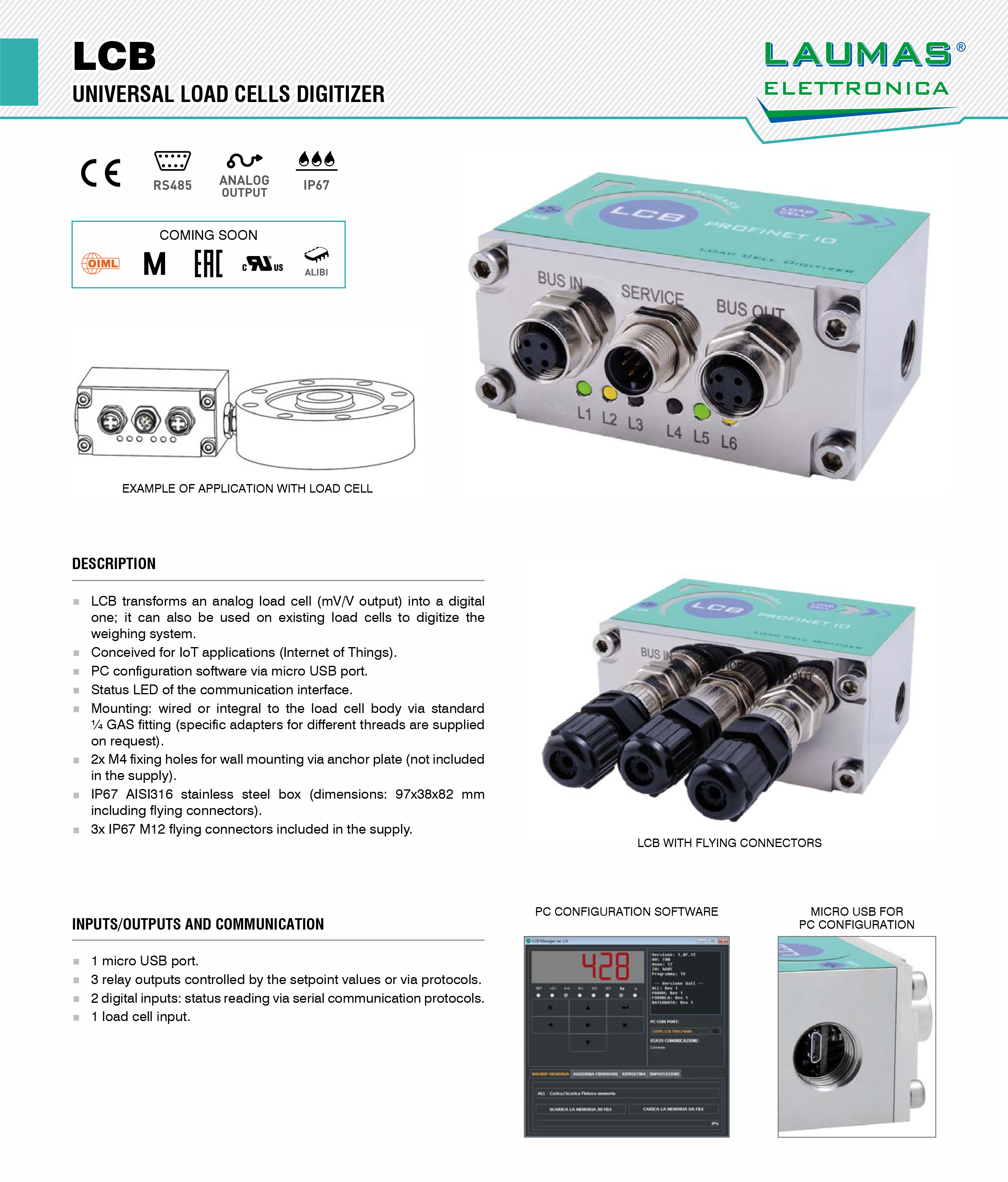 LCB重量變送器用于稱重傳感器的數(shù)字化儀/重量變送器,著眼于物聯(lián)網(wǎng)(物聯(lián)網(wǎng))(物聯(lián)網(wǎng))。IP67接線盒由AISI 316不銹鋼制成,適用于惡劣環(huán)境。三個(gè)IP67 M12連接器。通訊接口的六個(gè)指示燈。尺寸:97 x 38 x 82毫米(包括連接器)。Drd廣州南創(chuàng)電子科技有限公司