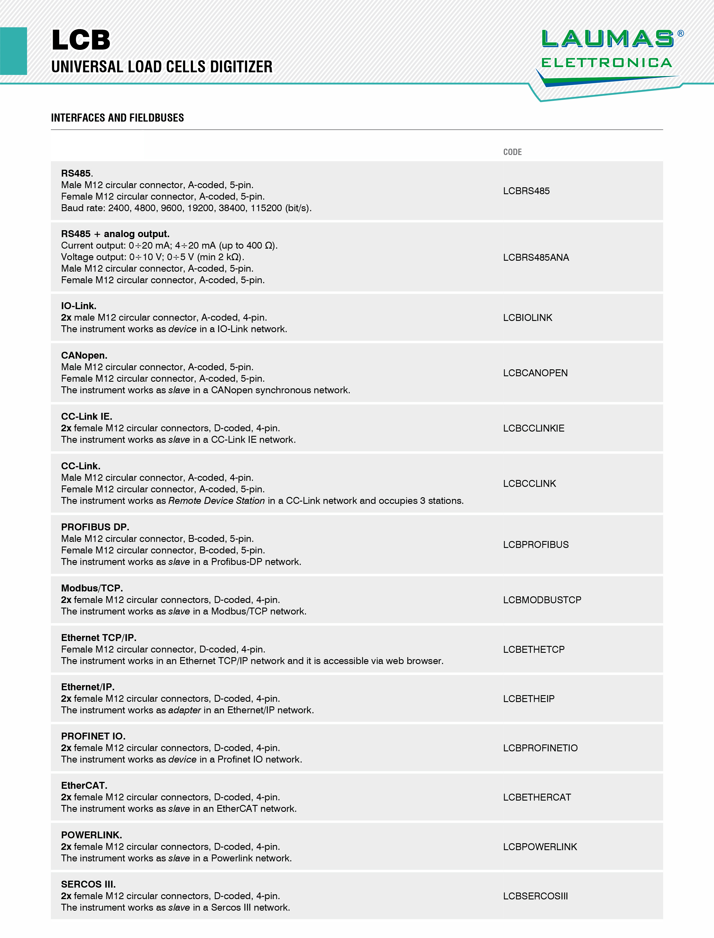 廣州南創(chuàng)專業(yè)提供意大利Laumas_LCB重量變送器,原裝正品,質(zhì)量保證,貨期短,美國(guó)CHECKLINE打造頂級(jí)傳感器品牌,【華南區(qū)★一級(jí)經(jīng)銷(xiāo)商】做中國(guó)的,世界的工業(yè)備品備件分銷(xiāo)專家,(LCBRS485、LCBRS485ANA、LCBIOLINK、LCBCANOPEN、LCBCCLINKIE、LCBCCLINK、LCBPROFIBUS、LCBMODBUSTCP、LCBETHETCP、LCBETHEIP、LCBPROFINETIO、LCBETHERCAT、LCBPOWERLINK、LCBSERCOSIII)訂購(gòu)方便,還可以享受當(dāng)?shù)貍€(gè)性化支持,免費(fèi)技術(shù)支持,歡迎來(lái)電訂購(gòu)。
