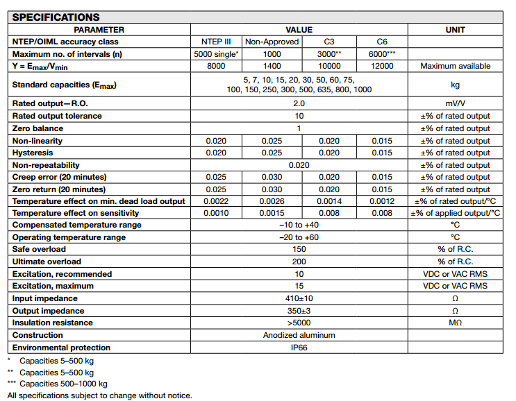 美國威世世銓Celtron LOC稱重傳感器系列所有量程如下:   gJN廣州南創(chuàng)電子科技有限公司