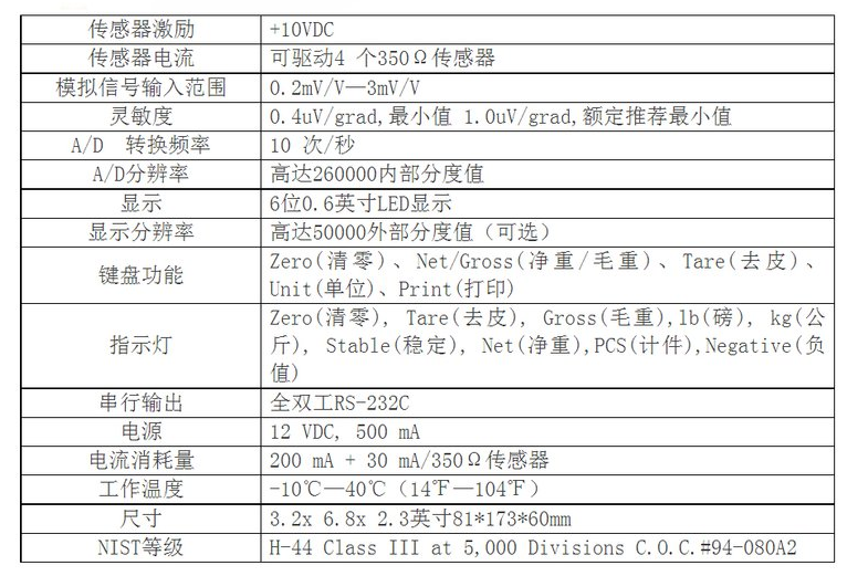 美國傳力稱重顯示儀表TI-500E的技術(shù)參數(shù)具體介紹:TI-500E稱重儀表Transcell傳感器激勵(lì):+10VDC傳感器電流:可驅(qū)動(dòng)4個(gè)350Q傳感器模擬信號(hào)輸入0圍:0.2mV/V---3mV/V靈敏度:0.4uV/grad,最小值1.0uV/grad,額定推薦最小值A(chǔ)/D轉(zhuǎn)換頻率:10次/秒A/D分辨率:高達(dá)260000內(nèi)部分度值顯示:6位0.6英寸LED顯示顯示分辨率:高達(dá)50000外部分度值(可選)鍵盤功能:Zero(清零)、Net/Gross(凈重/毛重)、TI-500E儀表Tare(去皮)、Unit(單位)、Print(打印)指示燈:Zero(清零),Tare(去皮),Gross(毛重),Ib(磅),kg(公斤),Stable(穩(wěn)定),Net(凈重),PCS(計(jì)件),Negative(負(fù)值)串行輸出:全雙工RS-232C電源:12VDC,500mA電流消耗量:200mA+30mA/350Q美國傳力稱重顯示儀表TI-500E傳感器工作溫度:-10℃---40℃(14°F---104F)尺寸:3.2"×6.8”×2.3”NIST等級(jí):H-44 Class III at 5,000Divisions C.O.C.#94-080A2保修:1年保修。Qnr廣州南創(chuàng)電子科技有限公司