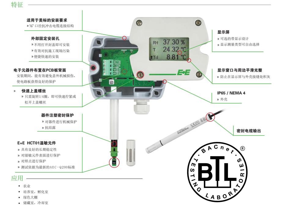 E+E ee210溫濕度顯示儀表防止在顯示屬與外殼接繼處積灰  快速上蓋螺絲 IP65/NEMA 4  只需旋轉(zhuǎn)1/4圈,即可快速擰緊或 ,外光  松開上蓋螺絲 器件注塑密封保護(hù),應(yīng)用農(nóng)業(yè) 培養(yǎng)室,孵化室 綠色大棚 儲(chǔ)藏室,冷卻室 氣象控制Ybo廣州南創(chuàng)電子科技有限公司