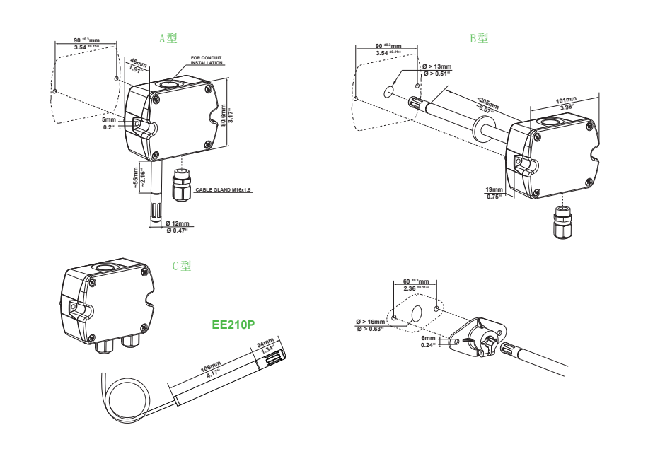 奧地利E+E ee210溫濕度探頭安裝尺寸圖:Ybo廣州南創(chuàng)電子科技有限公司